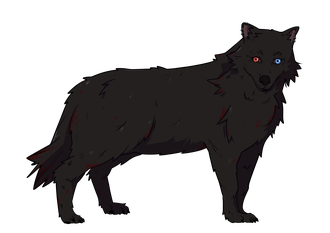 | Approximately 3 feet tall on all fours, covered in black fur with red streaks. Those mismatched orbs prominently glowing once again. |